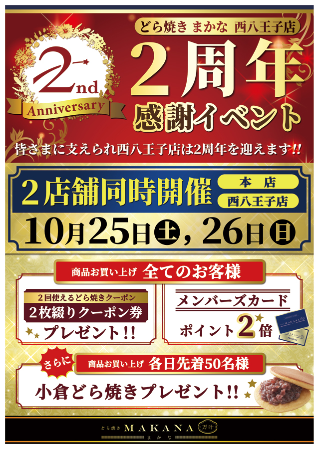 2025年10月、おかげさまで、どら焼き まかな 西八王子店は開店2周年を迎えます!!