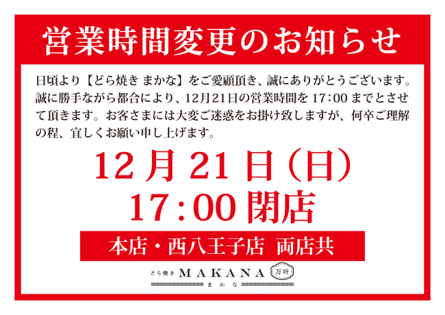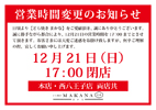 誠に勝手ながら都合により、12月21日(日)の営業時間を17時までとさせて頂きます。