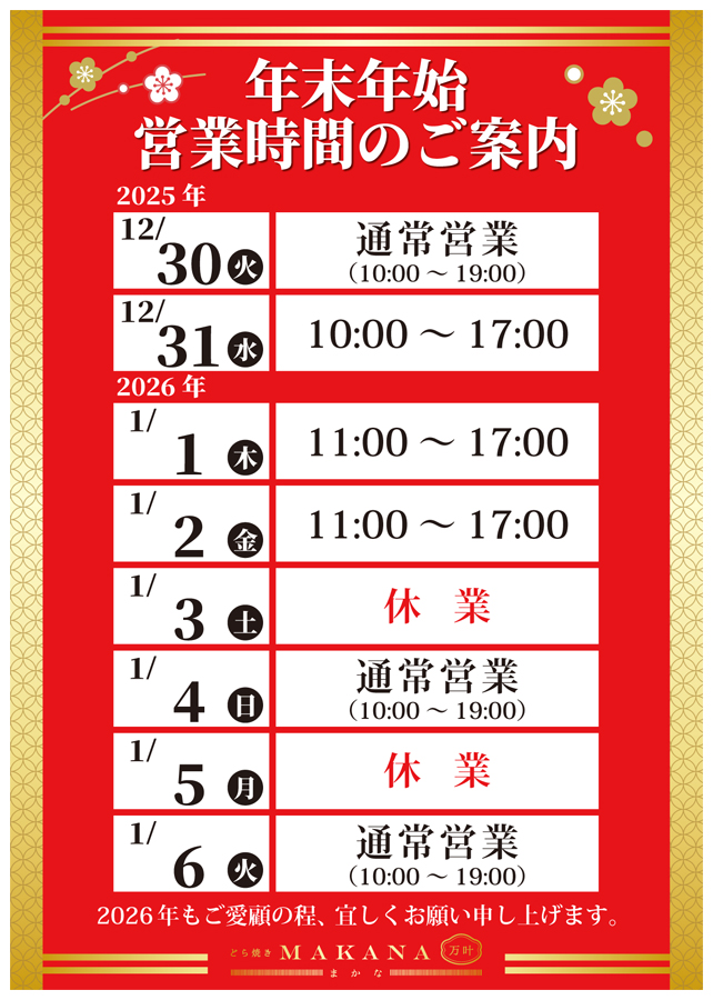 - 年末年始(2025-2026)の営業に関しまして<2025.11.22>