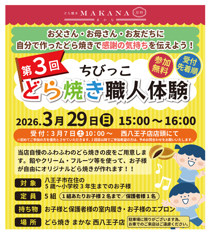 - お子様向け『第3回どら焼き職人体験』開催のご案内<2026.02.28>