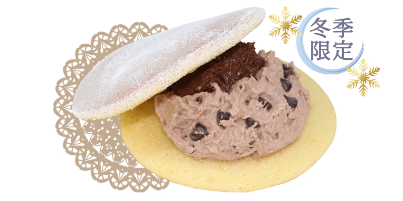濃厚な生チョコレートとチョコチップ入りのチョコレートクリーム。生地にはホワイトチョコのパウダーをまぶした、冬季限定どら焼き♪